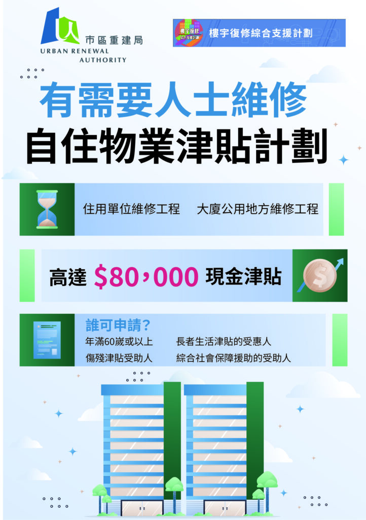為全港長者自住業主,提供財政資助,以維修保養他們的單位和提升樓宇的安全水平外,亦優化計劃至涵蓋領取綜合社會保障援助及傷殘津貼的自住業主;同時亦提高每位合資格業主每單位的津貼上限,上調至高達80,000元;及放寬長者申請人的資產上限。